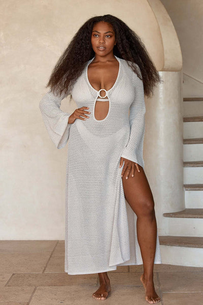 Attention all babes and beach bums! This slim-fit dress is a must-have for your vacation wardrobe. With a solid sheer pattern and playful cutouts, rings, and a split element, it's the perfect cover up for those long summer days. Let this maxi dress be your go-to for the complete look.