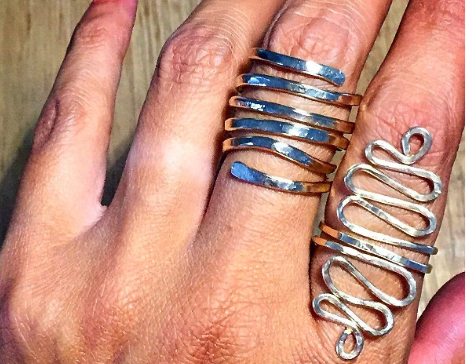 The 'Le Grand Coil' Wrap ring is the perfect piece for all occasions, moods and persuasions. Simple and dazzling, a single piece of hearty metal (14 Karat Gold, Rose Gold Filled or Argentium Silver) is painstakingly hammered and forged into a 5-Tiered wrap ring. Virtually indestructible, this can hold up to water submersion and other extreme exposures. Strong yet comfy and slightly malleable to wear. Adjustable at top and bottom rungs. Also available in solid gold metal options. The 'Le Grand Coil" Wrap ring is a must have everyday piece.