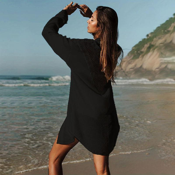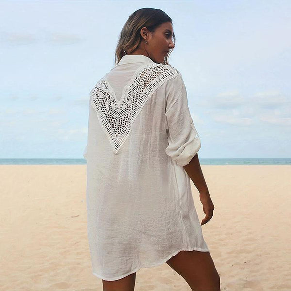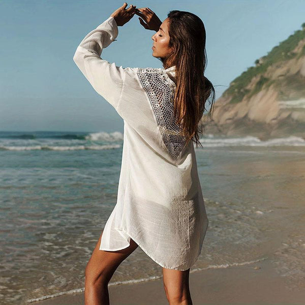 The Melrose Shirt Beach Cover Up features a Western boho style and a comfortable loose fit. Made from a blend of cotton, it's perfect for a day at the beach. The solid pattern adds a unique element while button closures and lace/tulle/fishnet accents make it stand out.